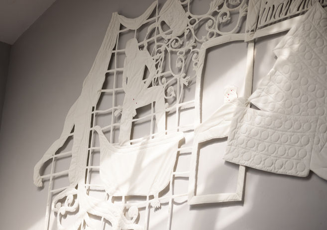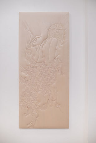 The title of Lucie Rosicka's first solo exhibition (1998) after graduating from the Academy of Fine Arts loosely refers to Garrett Hong's book of the same name, in which the mirror serves as a medium for self-discovery with an overlap into a societal reflection. Her embroidered paintings have long carried an autobiographical accent, so that they can realistically be thought of as a kind of visual diary. It is not only that she openly thematizes the more or less hidden circumstances of her life, but also that her main subject from the beginning has been almost exclusively her own body. It still reliably serves in her work as a reference of personal time and life situation, but with this project, both the perspective of its representation and the information it carries are clearly changing. Previously, the typical mobile phone and selfie-poses have been replaced by a searching look in the mirror. Also, the bathroom - once a tantalizing setting for exciting images or a place of intimate grooming - has been transformed into an oasis of calm and time to oneself. Motherhood became the catalyst for all this. And it was the transformations it set in motion that became the leitmotif of the exhibition. Through herself, Lucie Rosicka has always named themes that resonate in a broader generational context, be it the pressures of self-presentation, partner separation or issues of self-acceptance. After all, this is probably the basis for her favourite principle, where she began to accentuate imperfect areas of the body with decorative details typical of the textile industry, for example, she aestheticized inflamed acne pimples with beads. This approach has not changed, only the spectrum of her interest has opened up even more. In addition to stretch marks, hair fall or traces of breastfeeding, a special place was given to polycystic ovary syndrome PCOS - a hormonal disorder in women that is accompanied by cysts on the ovaries that cause infertility and is also manifested by increased pubic hair growth. In this case Lucie Rosicka also proceeded to a symbolic substitution. This not only distances her work from being descriptive and functions as a decorative element that subverts the emotional tone in a somewhat romantic way, but also has a strong meaning-making potential. The beads and 3D printed spines remain what they really are, an unwelcome intruder in the space of the body, in no way detracting from the urgency of the subject matter, but nevertheless shifting the context of the visual reading and metaphorically bringing new meanings into play. Perhaps the most obvious parallel is with the rose. The author herself develops this in her works in a rather wide range, which includes direct references to the visual aspect as well as more ambiguous and sometimes a little shy games of meaning, ranging in content from the climbing to the "pricking".