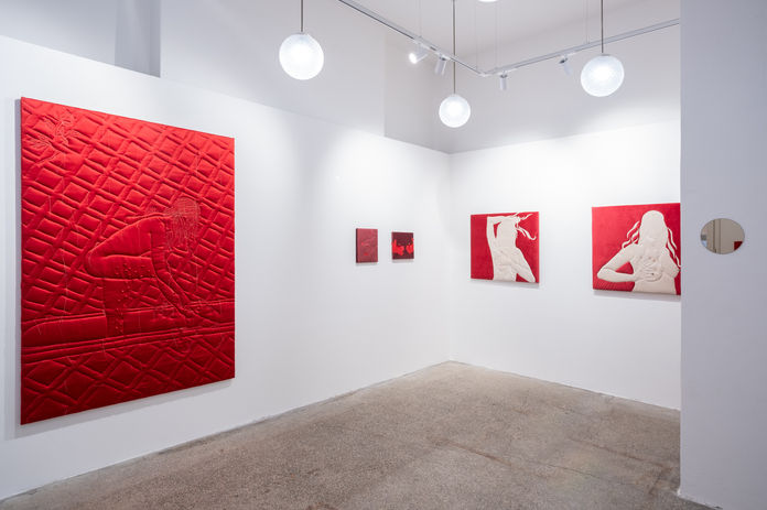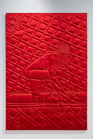 Rosická’s approach combines velvet and batting layers, which she stitches together and enhances with pastels, expired cosmetics, airbrushing, and gel nail polish. Her work bridges the gap between painting and textile art, influenced by Czech textile traditions and contemporary fashion trends.