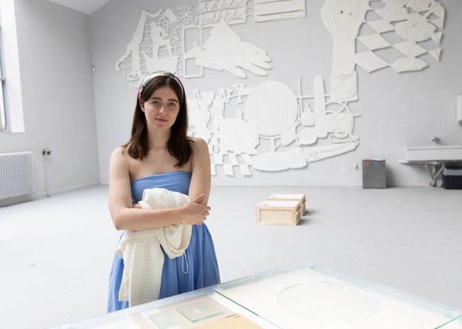 During her artistic journey, Rosická initially intended to continue her previous work of quilted paintings stretched on frames. However, several factors, including consultations with her advisors and a residency in Karlovy Vary, led her to explore new techniques. In Karlovy Vary, she experimented with "petrifying" her quilted works in mineral-rich thermal waters, creating unique, stone-like textures that echoed the town's kitschy souvenirs.
